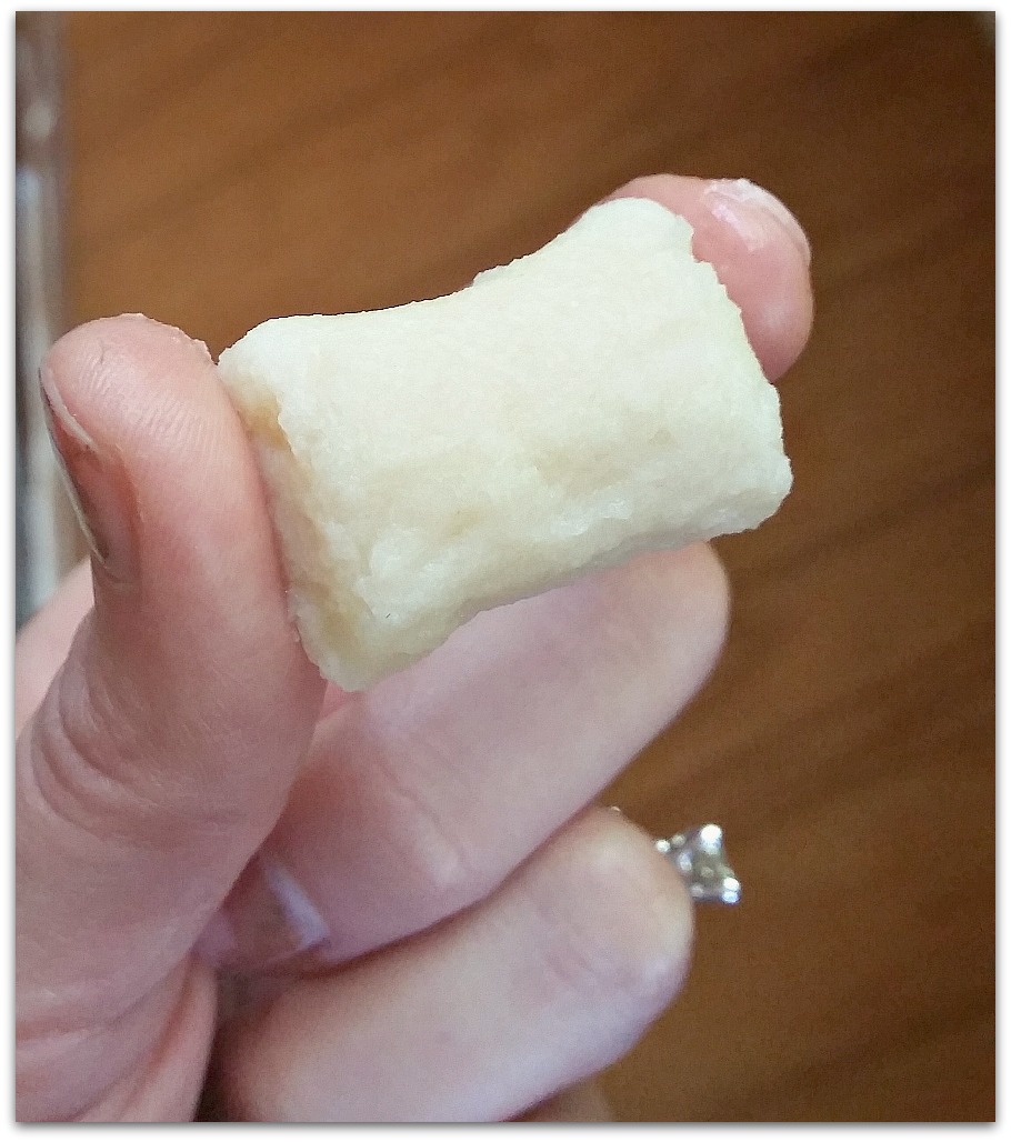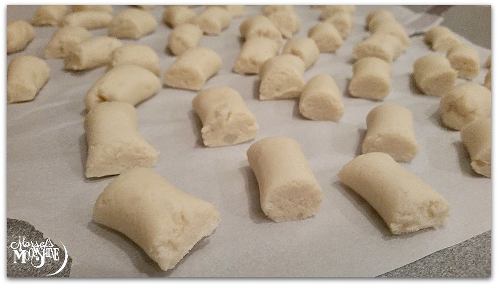 Take a section of dough and roll it out on a floured surface. The little log should be between a half-inch and an inch in diameter. (Funny -- this is also how you roll out homemade Tootsie Rolls!) Cut the rolls into one-inch pillows.