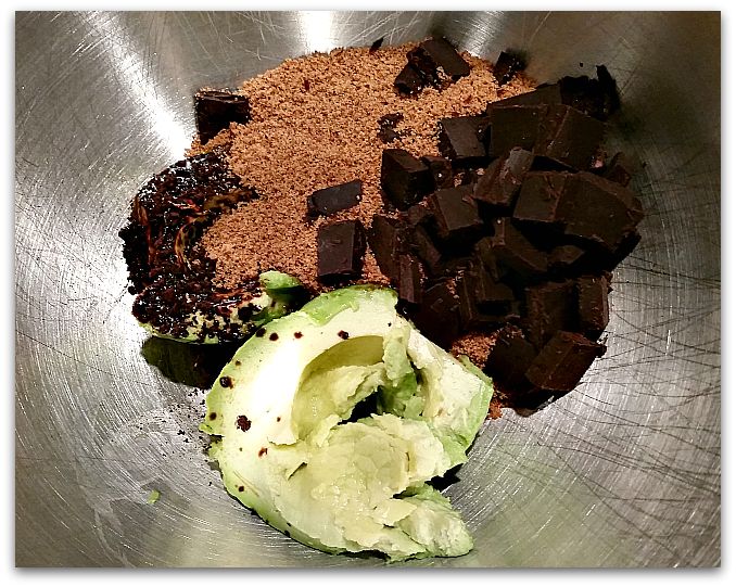 In a large mixing bowl, combine the avocado, sugar, chocolate chips, cocoa powder, instant coffee, and cinnamon. Cream the ingredients until they are mushed together. Add in the flax/bourbon mixture and baking soda. You will have a beautiful, fudgy mixture.